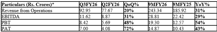 Profit Before Tax for Q3FY26 rose sharply by 48% QoQ to ₹8.42 crore. For the nine-month period, PBT grew by an impressive 54% YoY to ₹19.30 crore. This strong growth trajectory translated into a 72% QoQ rise in PAT to ₹7.00 crore for the quarter, while 9MFY26 PAT increased by 43% YoY to ₹14.87 crore.