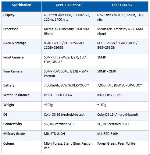 The OPPO F33 Pro 5G is available starting April 23, 2026, across offline retail stores, OPPO E-Store, Flipkart, and Amazon. It is priced at INR 37,999 for the 8GB + 128GB variant and INR 40,999 for the 8GB + 256GB variant. The device combines functionality with a sleek, premium design, featuring a distinctive Starry Sea camera module and a refined unibody build, and is available in Misty Forest, Passion Red, and Starry Blue. Its 120Hz AMOLED display further enhances the experience with smooth visuals and vibrant clarity, making it ideal for both work and entertainment.