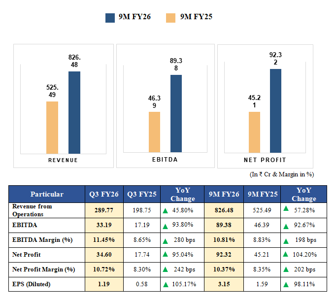 Revenue from Operations for 9M FY26 stood at ₹826.48 Cr, registering a robust growth of 57.28% YoY. EBITDA increased by 92.67% to ₹89.38 Cr, with EBITDA margins improving by 198 bps to 10.81%, demonstrating operating leverage and better cost management. Net Profit rose by 104.20% YoY to ₹92.32 Cr, while Net Profit Margin improved by 202 bps to 10.37%. EPS (Diluted) nearly doubled to ₹3.15, up 98.11% YoY.