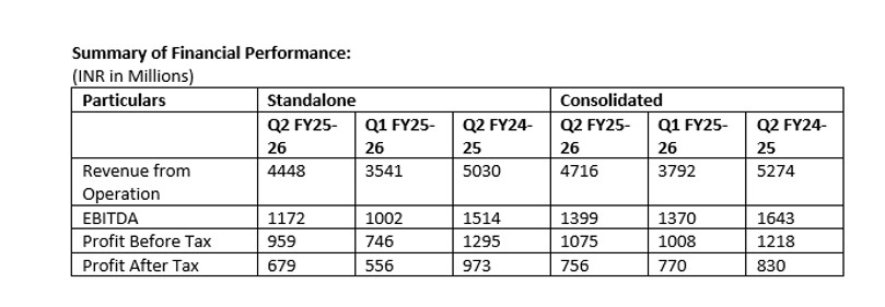Standalone Revenue from operations stands at INR 4,448 Million for quarter ended September 30, 2025, as against INR 3,541 Million for quarter ended June 30, 2025 and INR 5,030 Million for corresponding quarter ended September 30, 2024. The Profit before Tax (PBT) stands at INR 959 Million for September 30, 2025, as against INR 746 Million for quarter ended June 30, 2025 and INR 1,295 Million for corresponding quarter ended September 30, 2024.